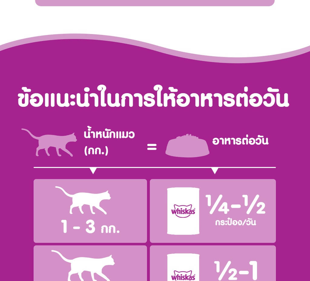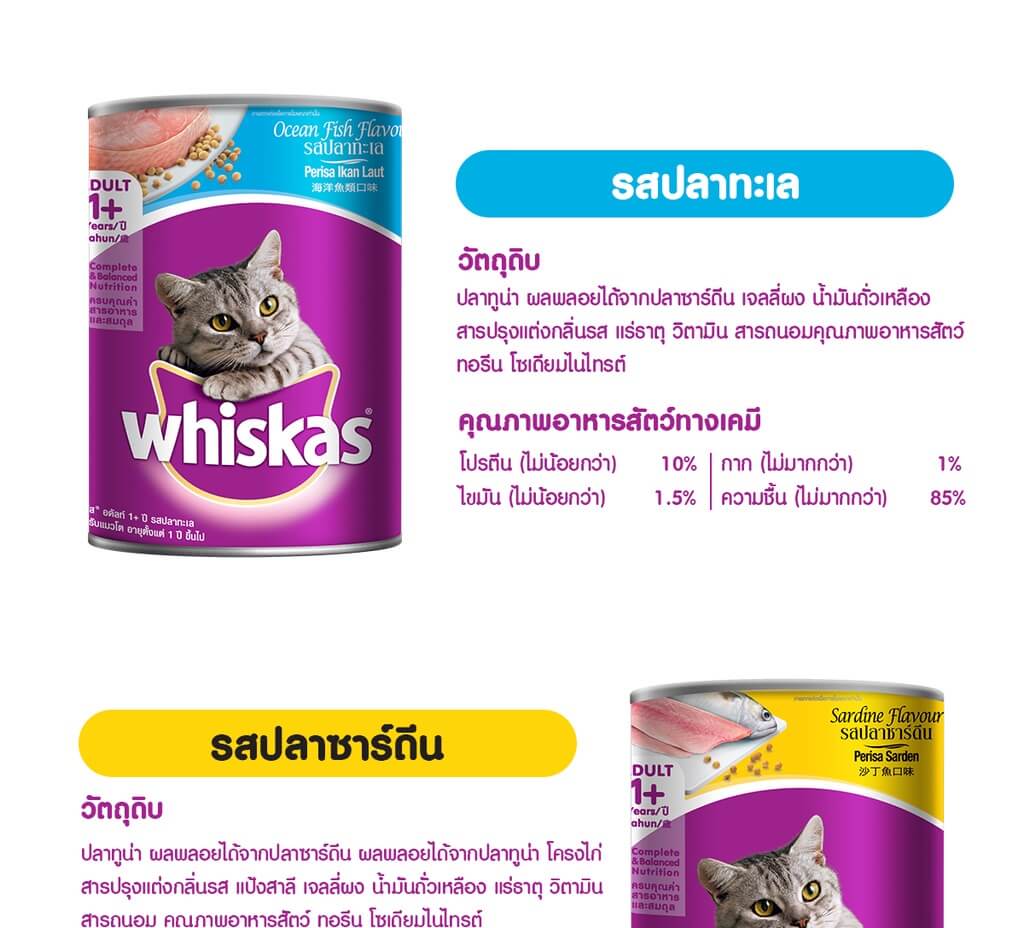 | รายละเอียดสินค้า | WHISKAS วิสกัส อาหารแมว ชนิดเปียก แบบกระป๋อง ขนาด 400g มีให้เลือก WK CAN TUNA (ทูน่า) WK CAN OCEAN FISH (ปลาทะเล) WK CAN SARDINE (ปลาซาร์ดีน) ●เส้นขนสุขภาพดีและเงางาม – อาหารเปียกแมววิสกัสมีกรดไขมันโอเมก้า 3 & 6 และสังกะสี ซึ่งช่วยบำรุงให้ผิวหนังสุขภาพดีและเส้นขนเงางาม ●ดวงตาสดใส – อาหารแมววิสกัสช่วยบำรุงสายตาให้กับแมวโต เพราะเต็มไปด้วยวิตามินเอและทอรีน ●สุขภาพหัวใจและระบบภูมิคุ้มกันแข็งแรง – อาหารแมววิสกัส แบบกระป๋องมีสารอาหารที่ครบถ้วนพร้อมสารต้านอนุมูลอิสระช่วยส่งเสริมให้น้องแมวมีสุขภาพหัวใจและระบบภูมิคุ้มกันแข็งแรง ●สารอาหารครบถ้วนและสมดุล– อาหารแมววิสกัส แบบกระป๋อง เป็นอาหารที่มีสารอาหารครบถ้วนและสมดุลเพื่อแมวโตอายุ 1ปี ขึ้นไป ●สารอาหารจำเป็น 41 ชนิด – อาหารแมว WHISKAS ชนิดเปียกมีสารอาหารจำเป็น 41 ชนิด ช่วยให้แมวของคุณเติบโตและมีพัฒนาการตามวัย
