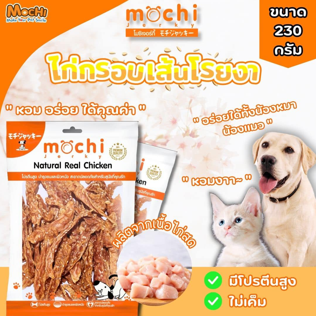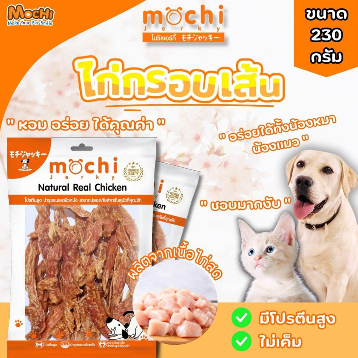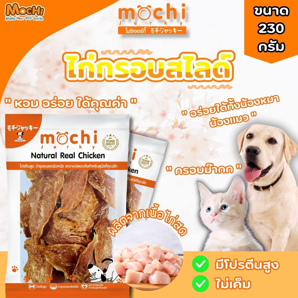 MochiJerky โมชิ ขนมสุนัข สันในไก่ ขนาด 230-300 G MOCHI สันในไก่กรอบเส้นโรยงา 230 G MOCHI สันในไก่กรอบสไลด์ 230 G MOCHI สันในไก่เส้น 230 G MOCHI สันในไก่นิ่มพันปลาเส้นทาโร่ 290 G MOCHI ไก่นิ่มแผ่นวาฟเฟิล 19 ชิ้น MOCHI สันในไก่นิ่มแซนวิชปลา 300 G MOCHI สันในไก่นิ่มแซนวิชปูอัด 300 G MOCHI สันในไก่นิ่มแท่ง (กุนเชียง) 300 G MOCHI สันในไก่นิ่มกุนเชียงนมชีส 300 G MOCHI สันในไก่กรอบอบแห้ง 250 G MOCHI ไก่กรอบพันทาโร่ 250 G MOCHI สันในไก่กรอบพันกระดูกผูก 250 G