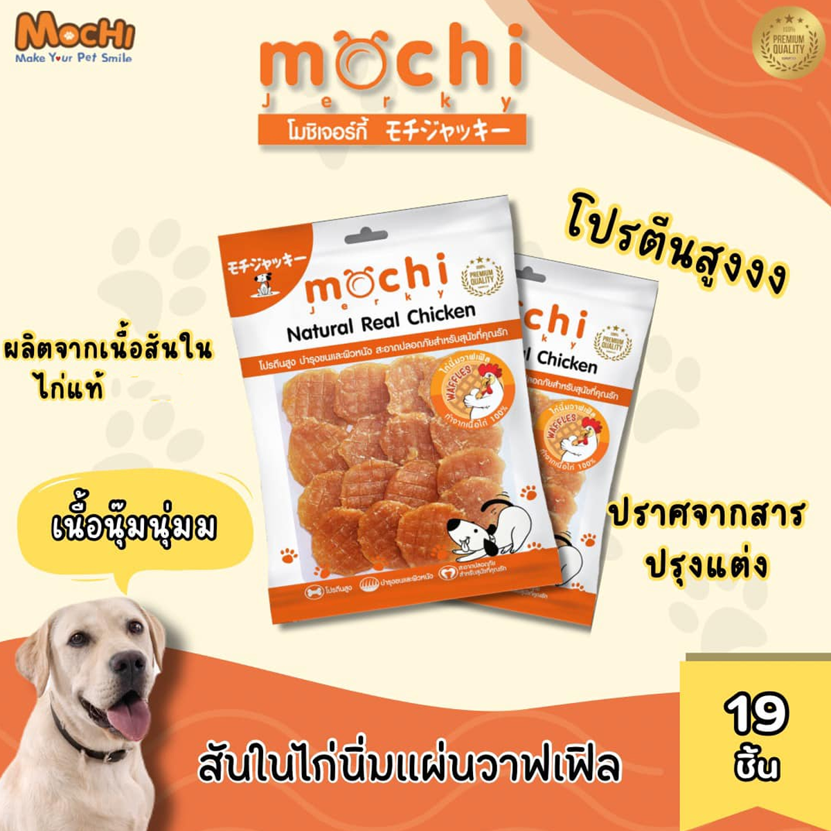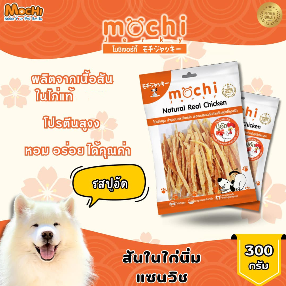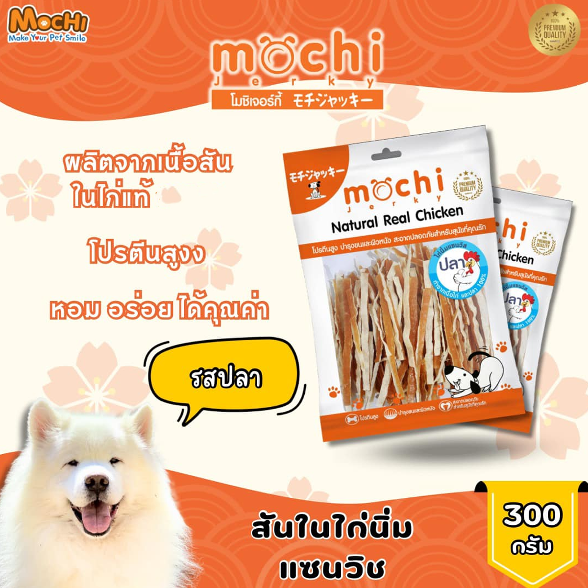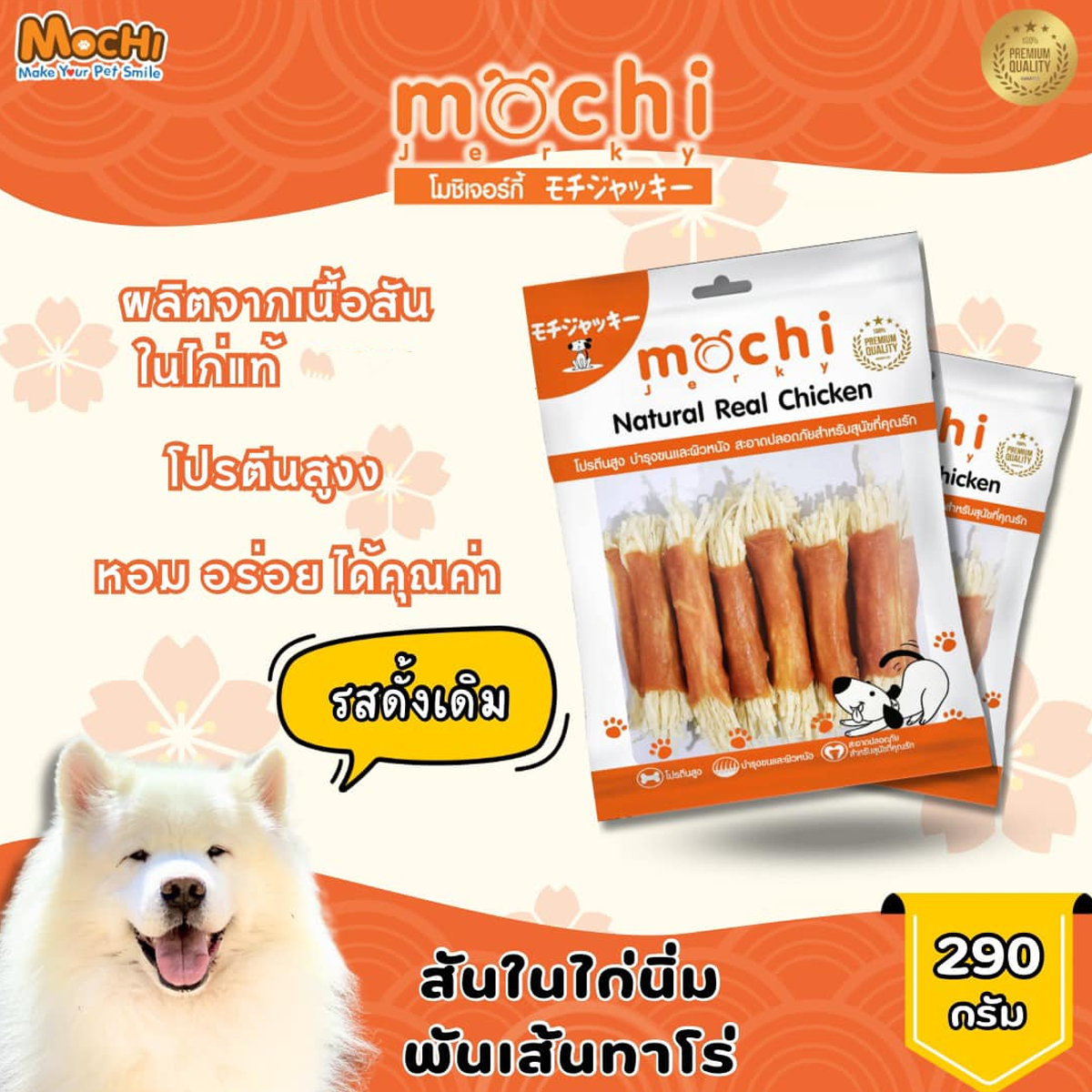 MochiJerky โมชิ ขนมสุนัข สันในไก่ ขนาด 230-300 G MOCHI สันในไก่กรอบเส้นโรยงา 230 G MOCHI สันในไก่กรอบสไลด์ 230 G MOCHI สันในไก่เส้น 230 G MOCHI สันในไก่นิ่มพันปลาเส้นทาโร่ 290 G MOCHI ไก่นิ่มแผ่นวาฟเฟิล 19 ชิ้น MOCHI สันในไก่นิ่มแซนวิชปลา 300 G MOCHI สันในไก่นิ่มแซนวิชปูอัด 300 G MOCHI สันในไก่นิ่มแท่ง (กุนเชียง) 300 G MOCHI สันในไก่นิ่มกุนเชียงนมชีส 300 G MOCHI สันในไก่กรอบอบแห้ง 250 G MOCHI ไก่กรอบพันทาโร่ 250 G MOCHI สันในไก่กรอบพันกระดูกผูก 250 G