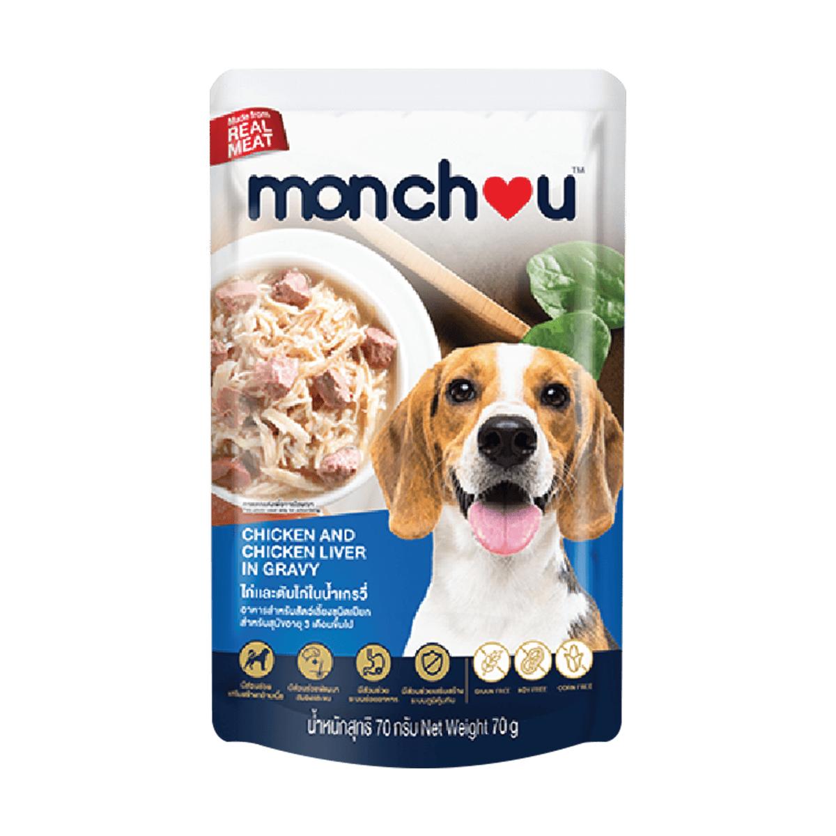 ปลาทูน่าและตับวัวในน้ำเกรวี่ ไก่และตับไก่ในน้ำเกรวี่ ไก่หน้าไข่ในน้ำเกรวี่ ไก่และปลาทูน่าในเจลลี่ ไก่หน้าเนื้อเป็ดในน้ำเกรวี่ ไก่หน้าเนื้อแกะในเจลลี่ ไก่หน้าไข่กับชีสในเจลลี่ มูสไก่และปลาทูน่า (Mousse Chicken + Tuna) ไก่หน้าปลาแซลมอนในน้ำเกรวี่ ปลาทูน่ากับตับวัวในเจลลี่ ไก่กับเนื้อวัวในน้ำเกรวี่ไก่กับไข่ (สำหรับลูกสุนัข) ในน้ำเกรวี่ MONCHOU POUCH DOG มองชู อาหารเปียกสุนัข ขนาด 70 กรัม แบบซอง บรรจุ 12 ซอง อร่อยเต็มคำด้วยรสชาติ ไก่และตับไก่ผสมผักรวม (แครอท ฟักทอง) เนื้อเนียนนุ่ม หอมยั่วน้ำลาย เหมาะสำหรับสุนัขทุกสายพันธุ์และทุกช่วงวัย ให้พลังงานและสารอาหารครบถ้วนจากโปรตีนคุณภาพสูง เสริมด้วยน้ำมันปลาแซลมอนเพื่อผิวหนังและขนที่สุขภาพดี
