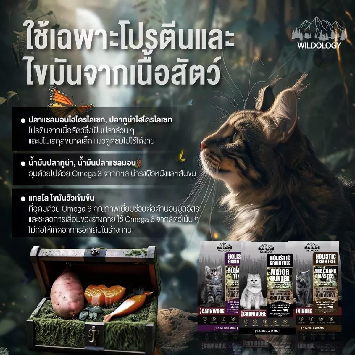 WILDOLOGY อาหารแมวแบบเม็ด เกรด Holistic Grain Free✨ WILDOLOGY The Grand Master อาหารแมวโตและแมวสูงวัย เกรด Holistic Grain Free สูตรปลาแซลมอนและทูน่า 1.5 กก. เลขทะเบียนอาหารสัตว์ 01 07 66 0310 คุณสมบัติเด่น